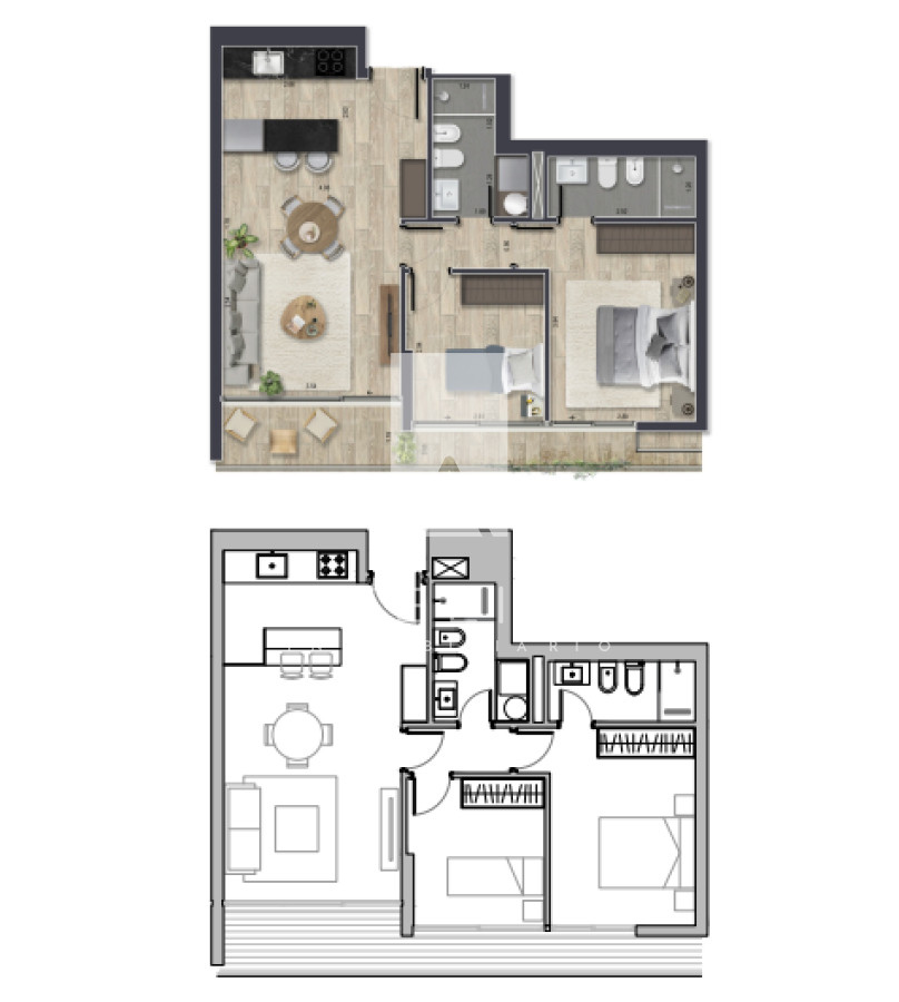 La planta se ubica en un piso medio. La misma, es frontal a la calle chiverta y se distribuye en 2 dormitorios (uno en suite), 2 baños y un amplio living comedor con una cocina integrada y salida a balcón espacioso.