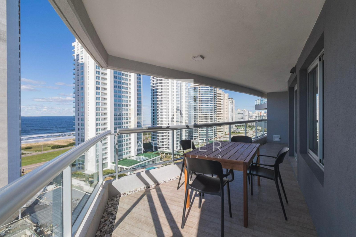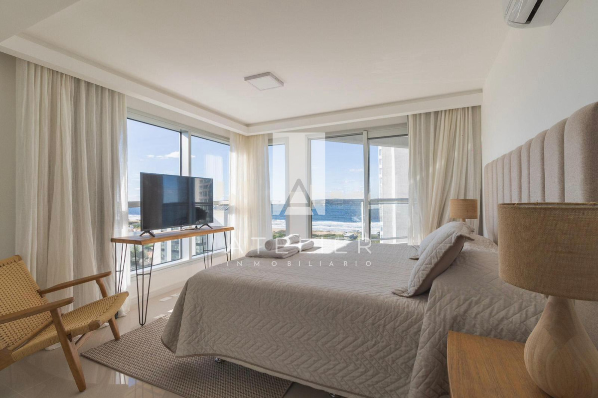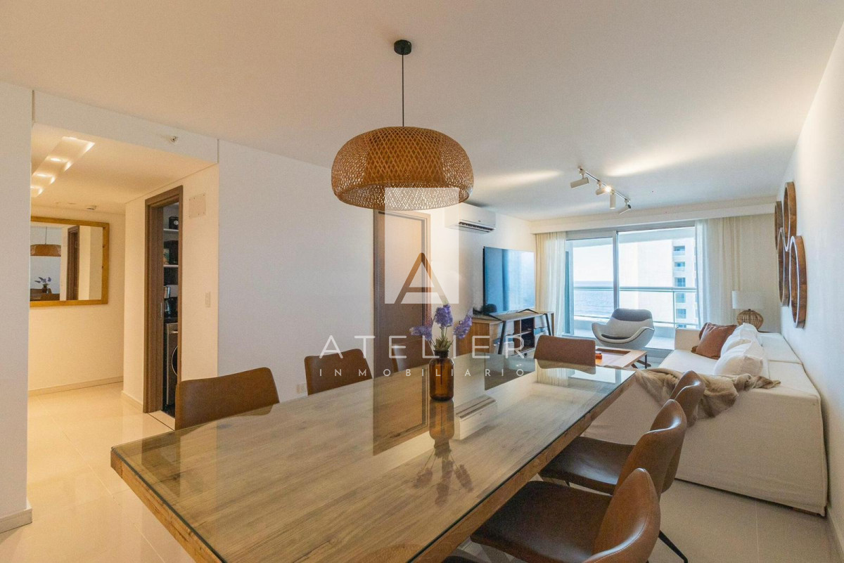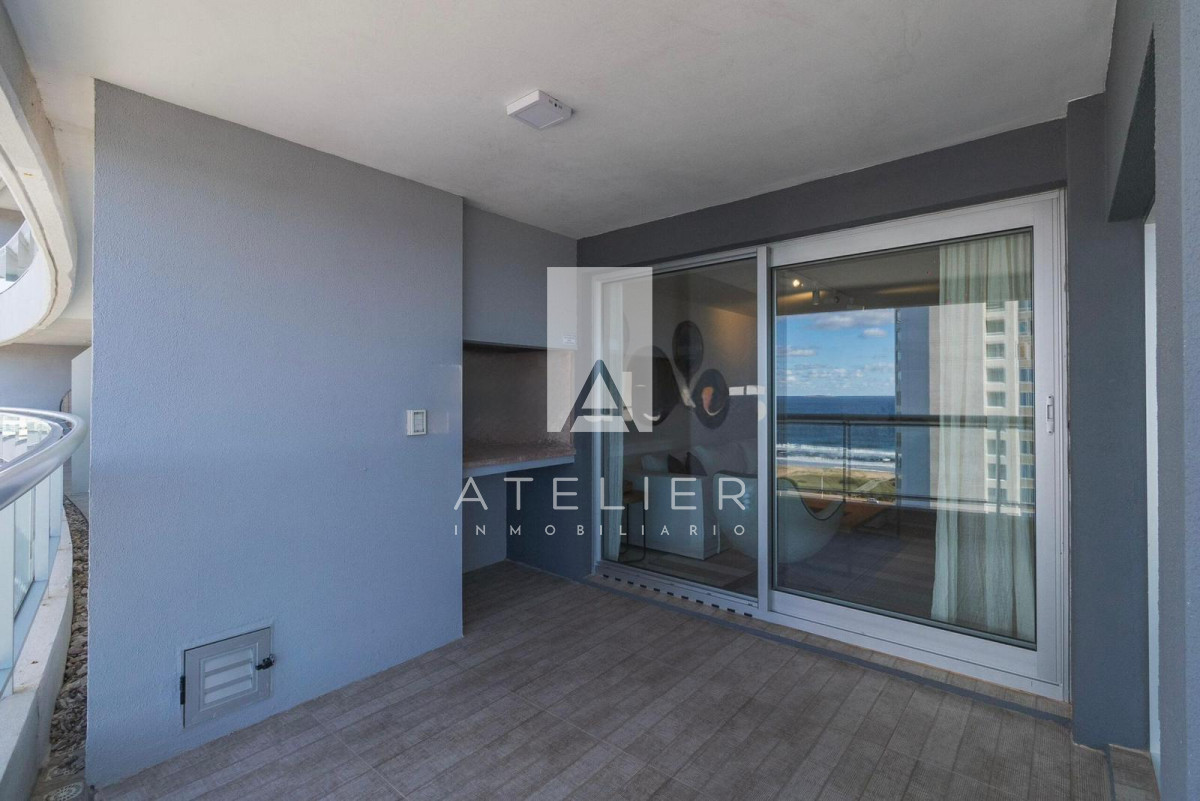 El living-comedor, rodeado de ventanales de piso a techo, conecta directamente con una terraza espaciosa equipada con parrillero privado, ideal para disfrutar asados, reuniones y momentos de relax con el océano como protagonista. Este balcón es uno de los puntos fuertes del apartamento, ofreciendo amplitud, privacidad y una vista ininterrumpida a la Brava.
