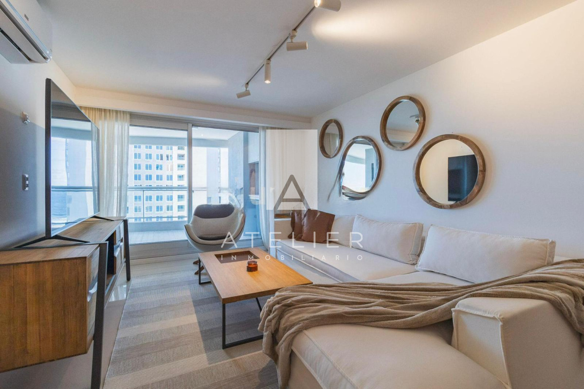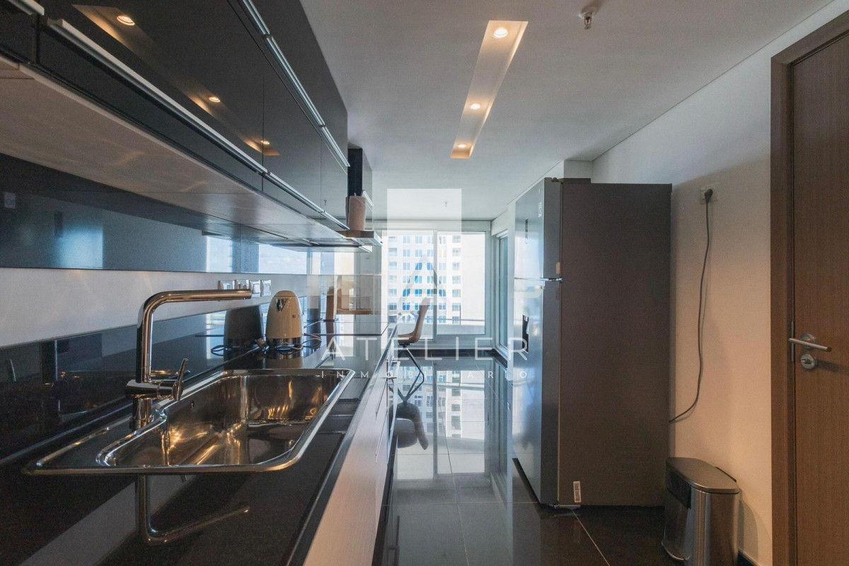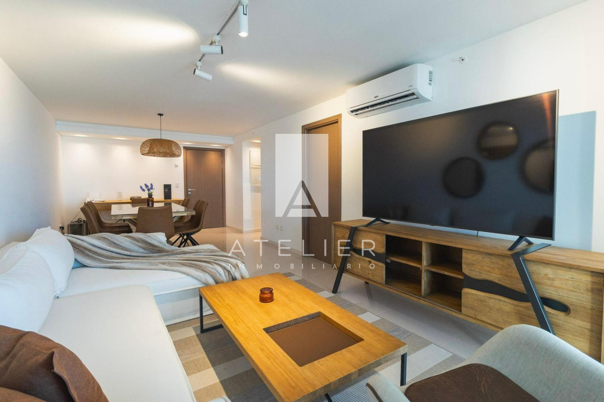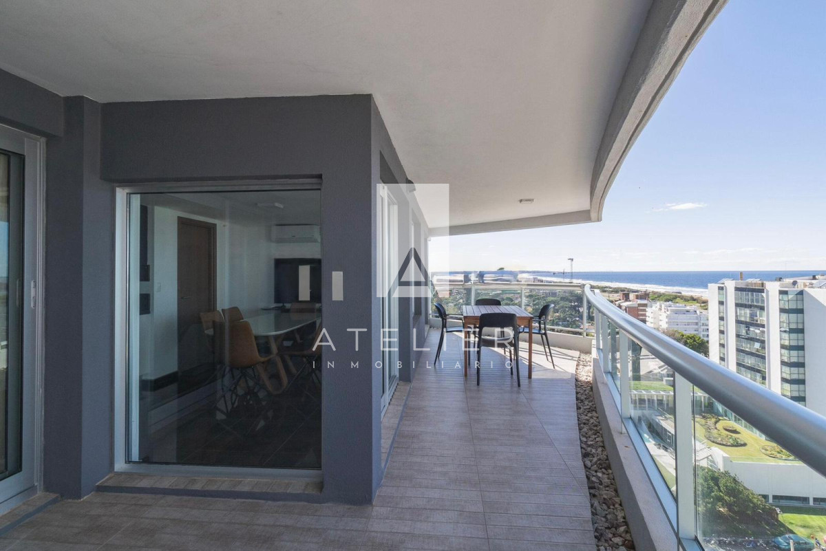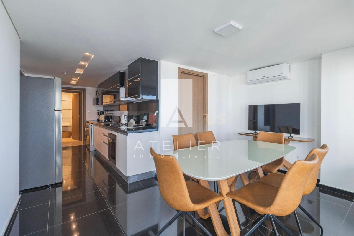 El living-comedor, rodeado de ventanales de piso a techo, conecta directamente con una terraza espaciosa equipada con parrillero privado, ideal para disfrutar asados, reuniones y momentos de relax con el océano como protagonista. Este balcón es uno de los puntos fuertes del apartamento, ofreciendo amplitud, privacidad y una vista ininterrumpida a la Brava.