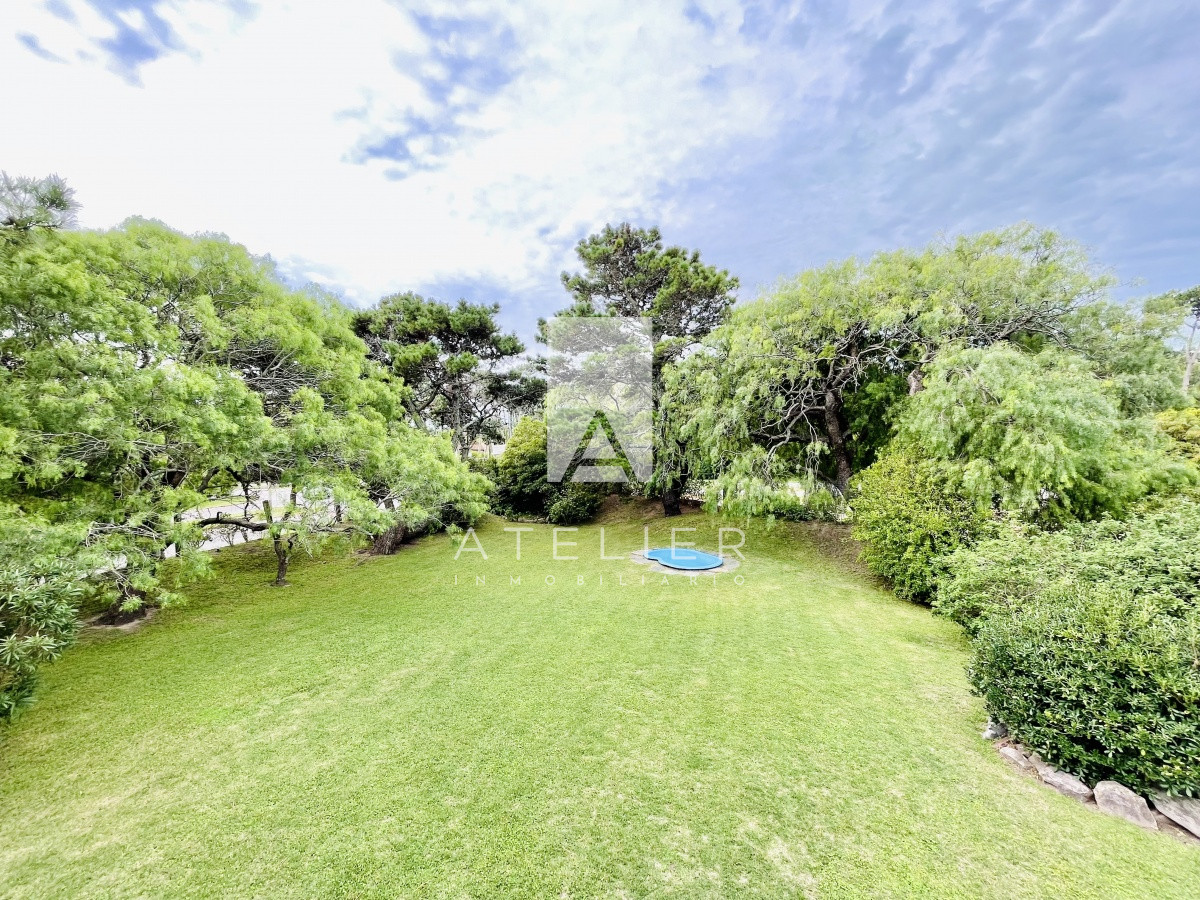 Gran jardín verde, completamente cercado, donde se ubica el parrillero techado con baño exterior, y la piscina.